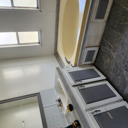 This project began as a seemingly standard bathroom remodel. Once we opened the walls, however, we discovered the need to completely rewire the electrical system, as well as replace the plumbing and drainage lines. In addition, black mold was found inside the walls, requiring a three-day specialized treatment.